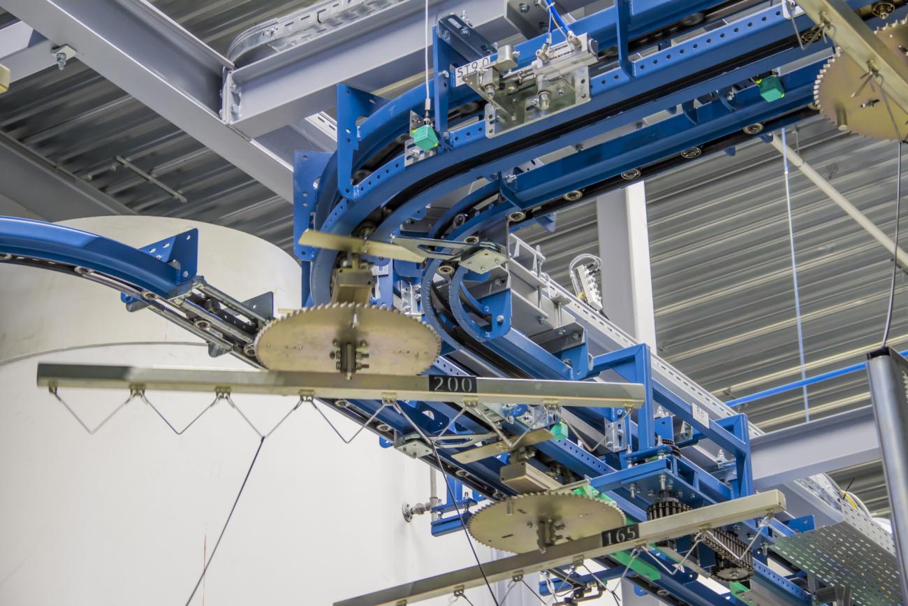 I convogliatori T1 Power & Free (birotaia) sono costituiti da sistema a doppio binario. Nel binario superiore scorre la catena di trazione, nel binario inferiore viaggiano i carrelli che trasportano i prodotti. Ganci di trascinamento fissati alla catena di trazione ad un passo costante permettono l’avanzamento del carrelli lungo il tracciato dell’impianto. La conformazione a denti mobili dei ganci ingaggia e trattiene saldamente il trolley per la movimentazione.