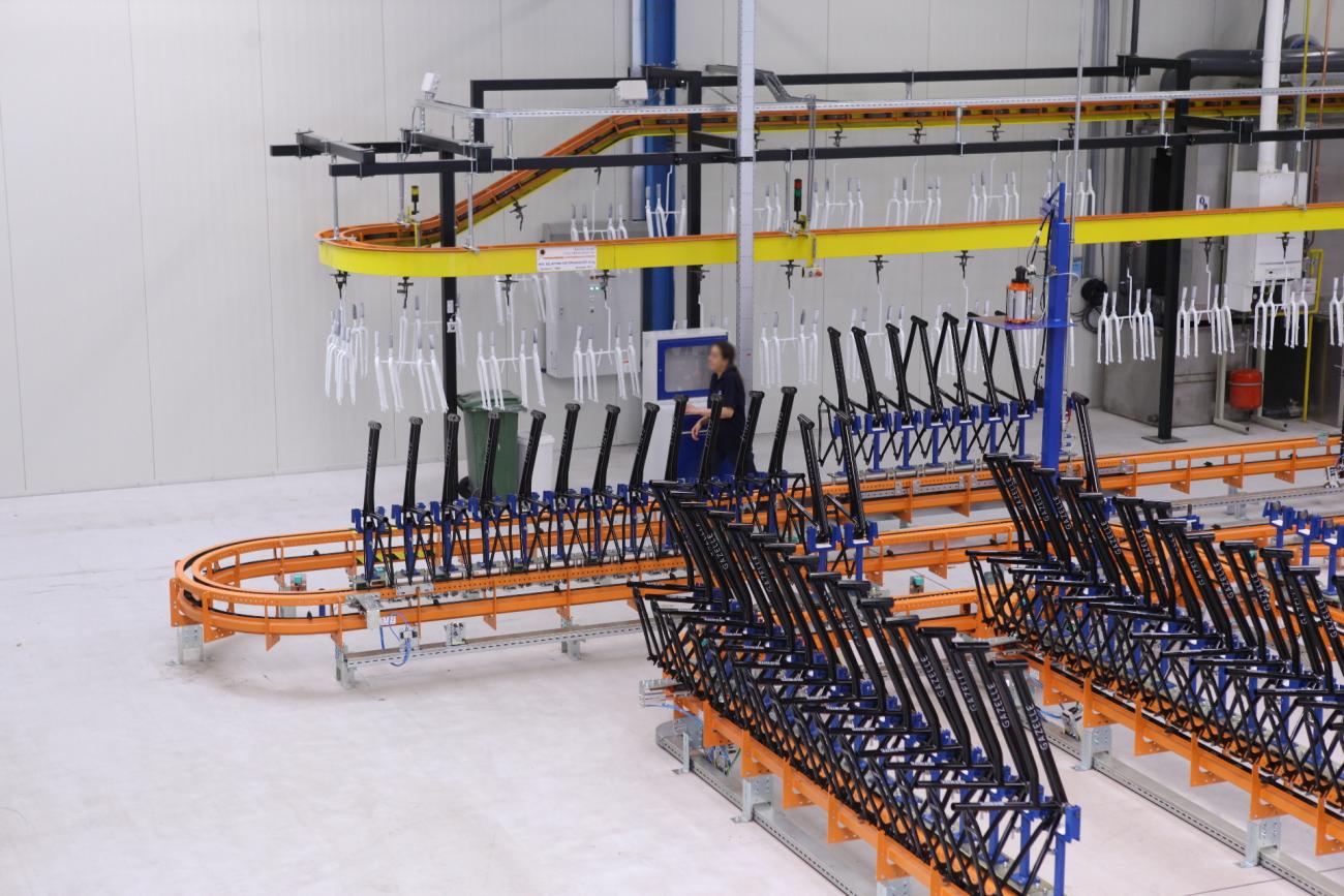 The F1 Power and Free floor conveyor system is based on the inverted version of our T1 Power & Free overhead conveyor. Since the conveyor chain is located below the free track and the product carrier, the risk of contamination to the product being carried is minimal.